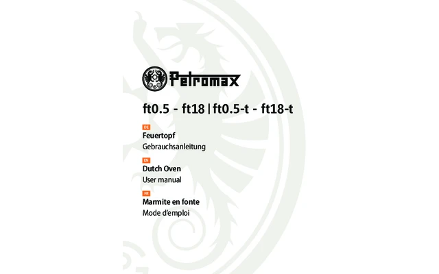 Feuertopf planer Boden (Dutch Oven), Gebrauchsanleitung (Deutsch/Englisch/Französisch)