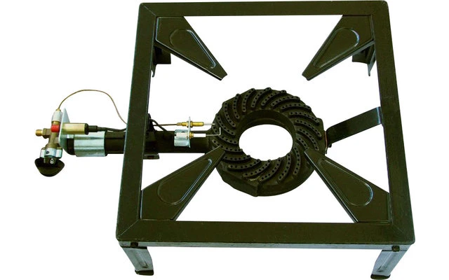 Hockerkocher mit einem windstabilen Brenner aus massivem Gusseisen und Gestell aus Stahlblech.